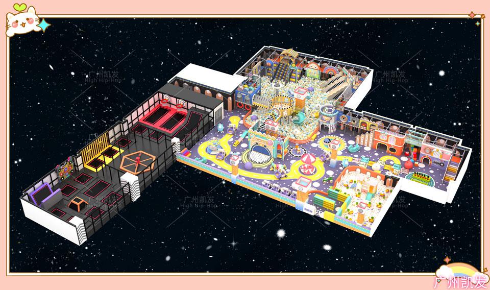 超级蹦床占了这个场地的面积大概三分之一,蹦床上方有篮球框,看看哪个小朋友可以通过超级蹦床跳得够高,然后实现扣篮的梦想,希望大家多多进球,多多得分,也符合小朋友们爱蹦跳的天性,是他们纯真的体现。